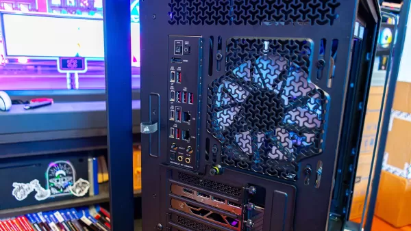 構成時に、フロントポートと電源ボタンを上部または下部に配置するかを選択できます。私のユニットは下部に配置されており、デスク設置に理想的です。床やリビングルーム設置を好む方は、上部配置を選ぶかもしれません。フロントパネルには4つのUSB-Aポートと1つのUSB-Cポートがあり、ほとんどのニーズに十分です。背面は、Asus ROG Crosshair X870E Heroマザーボードを搭載し、4つのUSB-Cポート、6つのUSB-Aポート、2つのイーサネットポート、そして内蔵グラフィックス用のHDMIポートを備えています。RTX 5090は、Blackwell GPUでは標準的な、3つのDisplayPortと1つのHDMIを追加します。