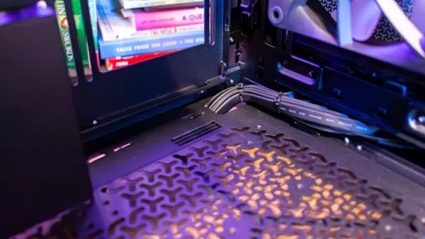 これらのバーは六角ボルトで固定されており、取り外すことは可能ですが、ゲーミングPCには不要な手間がかかります。一度内部にアクセスすれば、広々とした内部に感銘を受けるでしょう。14インチのグラフィックスカードを搭載しても十分なスペースが確保されており、優れた気流を実現しています。Originの入念なケーブル管理により、ほとんどの配線はマザーボードトレイの背面に隠され、グロメットを通して目的地へと整然と配線されています。