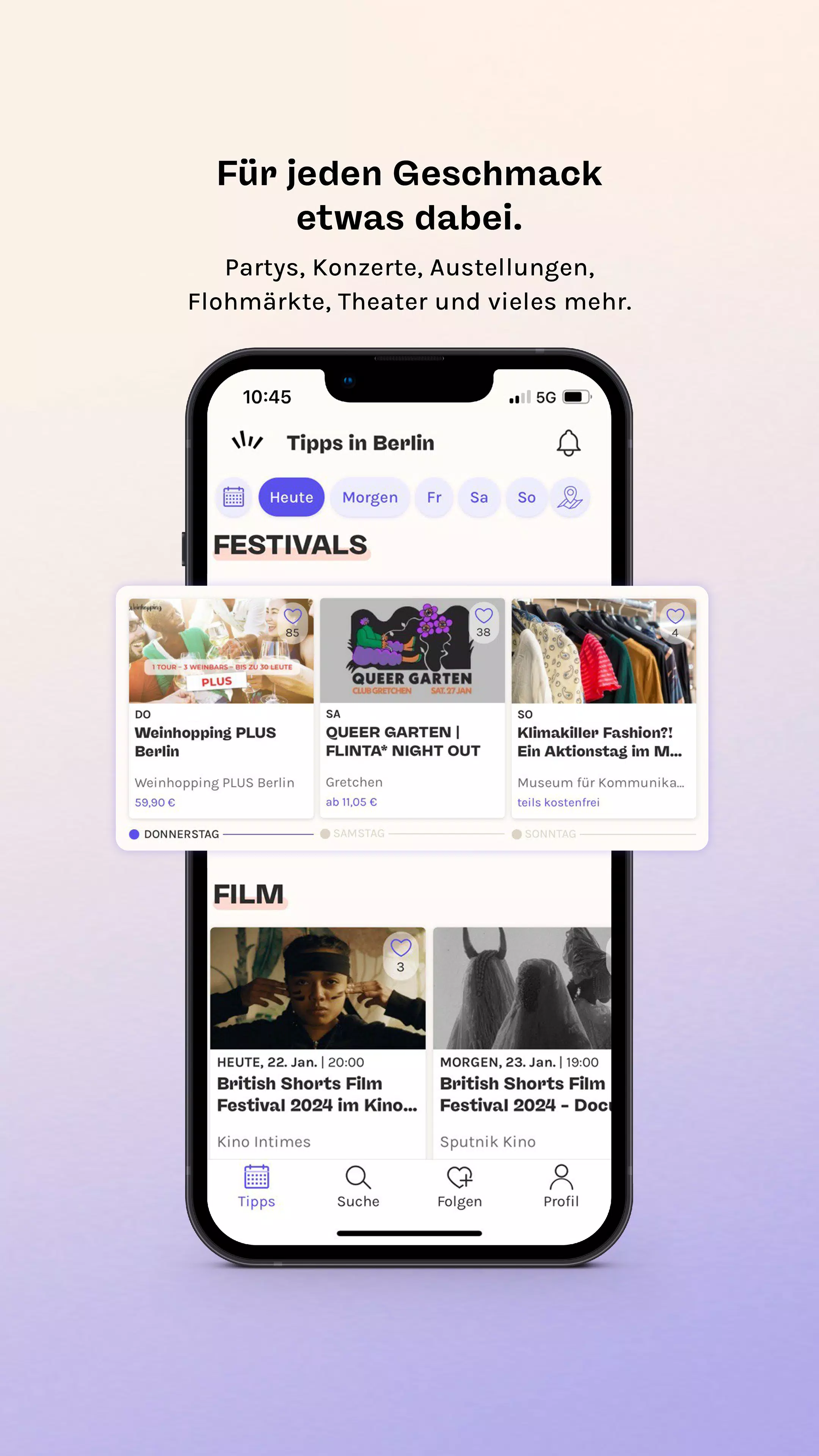 - パーティーやコンサートから読書、フリーマーケット、フェスティバル、ストリートフードフェスティバル、劇場、映画館、新しいお気に入りのスポット、屋外の映画館、話し言葉、展示会などまで、すべてを見つけてください。